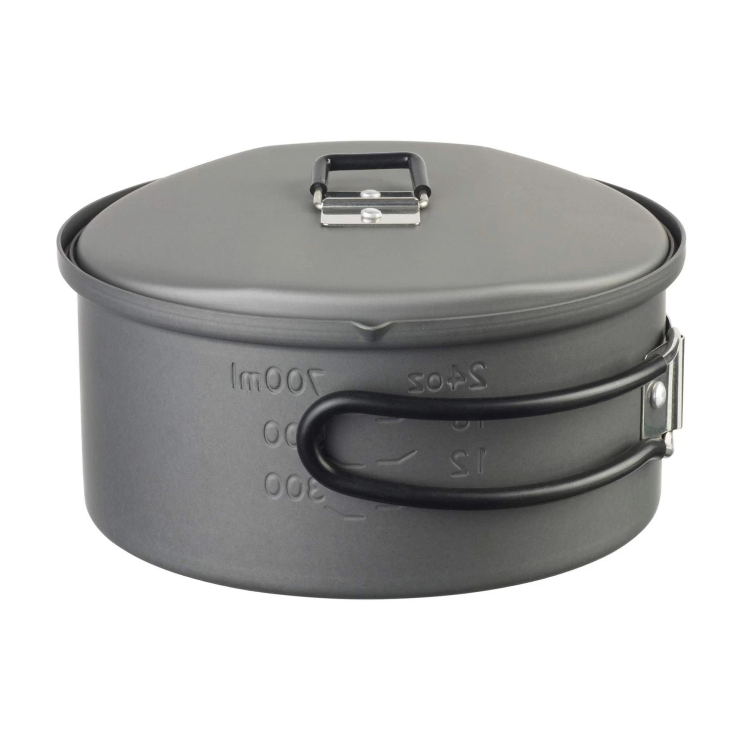 Leichter Aluminiumtopf mit 1100 ml Volumen, den du dank seiner Klappgriffe platzsparend im Gepäck verstauen kannst. Eine Volumenskala im Innern hilft dir beim Abschätzen von Wassermengen.
